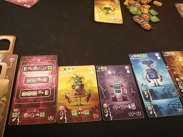 Nous allons obtenir des cartes droïdes, à nous de les démonter pour obtenir des ressources en défaussant la carte ou bien de fournir les ressources manquantes pour les recycler et les poser dans notre zone personnelle. Un recyclage gagnant pour un nouveau monde !